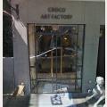 ドアハンドルやペーパーホルダーなど鉄製品が飾られていて、