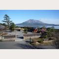 錦江湾を池に桜島を築城に見立てた借景庭園。園内や周辺には世界遺産暫定リストに登録された史跡が点在しています。