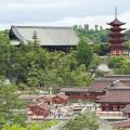 少し高い丘の上に立つ、秀吉ゆかりの寺と鮮やかな朱色の五重塔。ここから、厳島神社と大鳥居を一望できる。