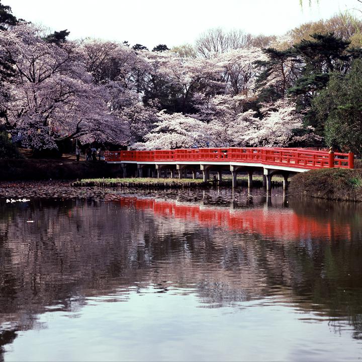桜とスイレンの名所。春は公園内に約600本の桜が咲き誇る。蒲池にかかる朱塗りの八つ橋も、桜の花でより一層華やぐ。